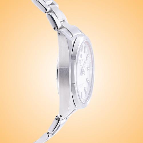 slim 11.7 mm in height, and rests upon a stainless steel bracelet with a