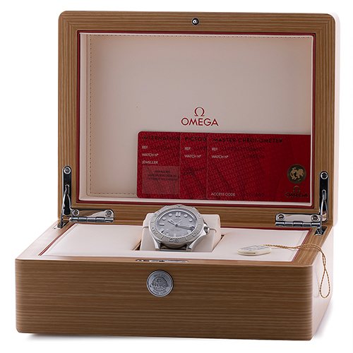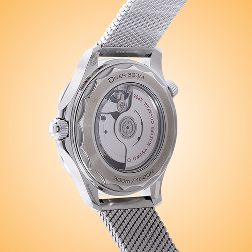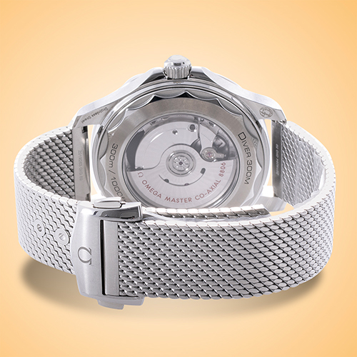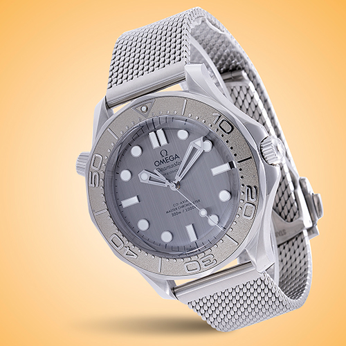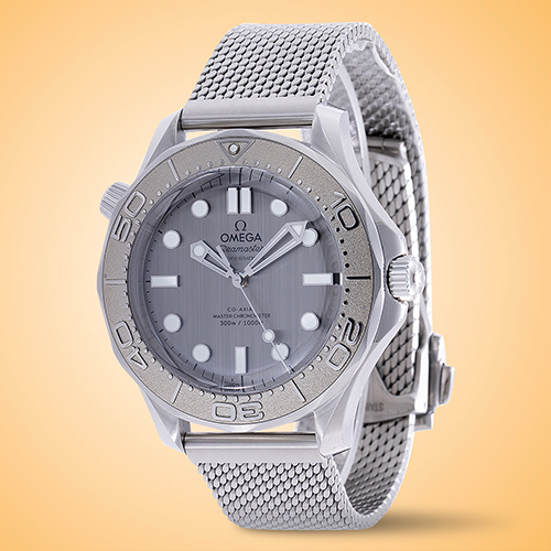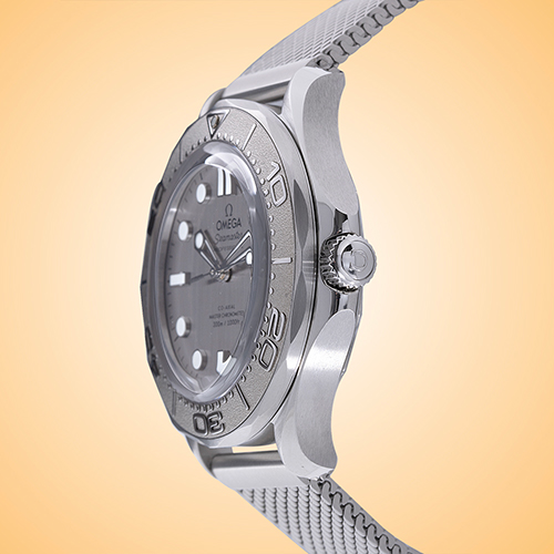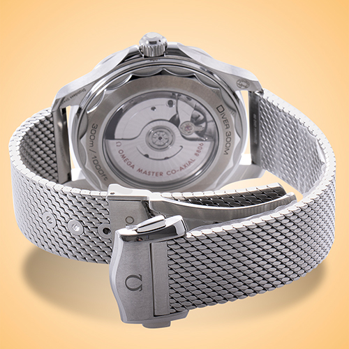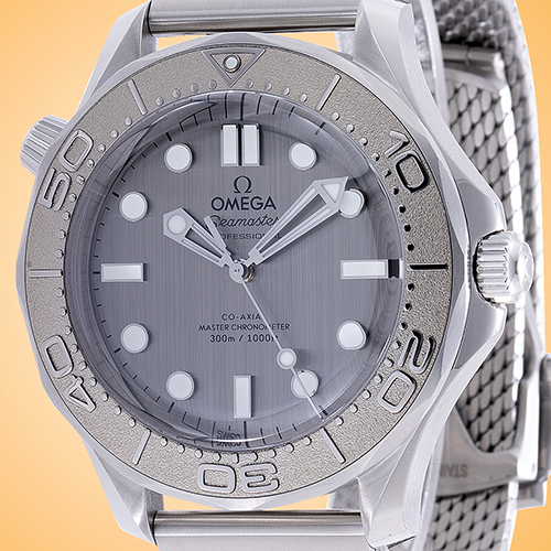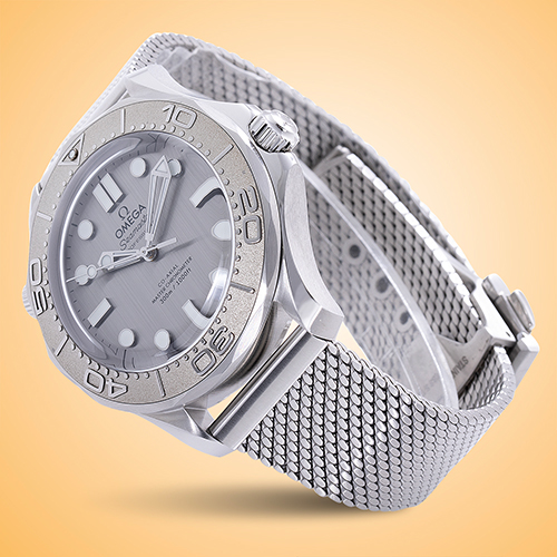 Standout features: Wonderful 300 m / 30 atm water resistance with helium escape valve and screw-down winding crown; rugged Grade 5 titanium bezel with laser-ablated dive scale and luminous SumerLuminova-filled dot at 12; highly accurate certified Co-Axial Master Chronometer; fashionable stainless steel mesh bracelet.