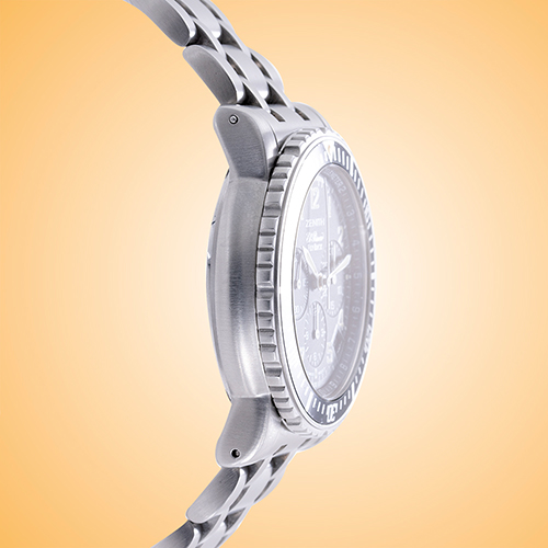 bi-directional rotating bezel with black steel insert, the watch