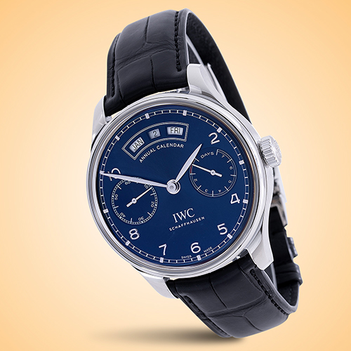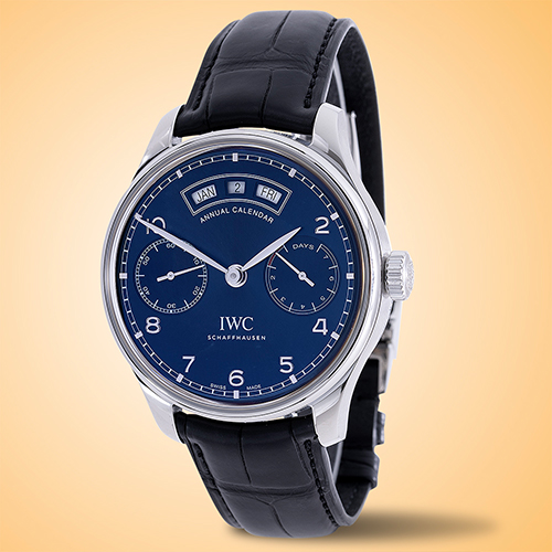 With its dashing blue dial, this Portugieser Annual Calendar watch by IWC will make a solid addition to your collection.