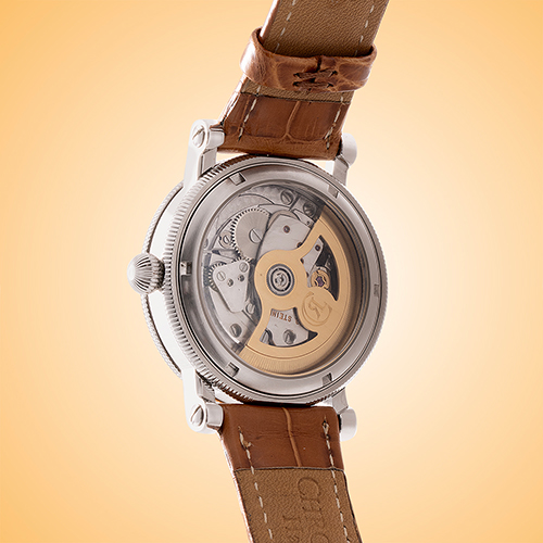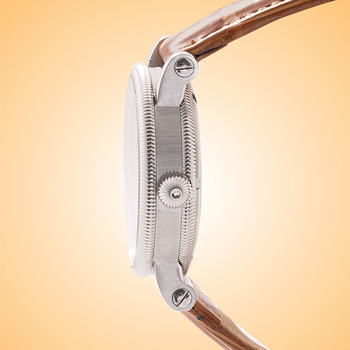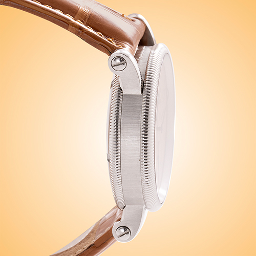 The round-shaped case is crafted in stainless steel with knurled upper and lower bezels, diameter is 34 mm (excluding crown, pushers and lugs), height is 11 mm, satin-finished case band, anti-reflective flat sapphire crystal, See-through case back showcasing mechanics of the movement, gold-plated winding rotor, water resistant up to 30 m / 3 atm.