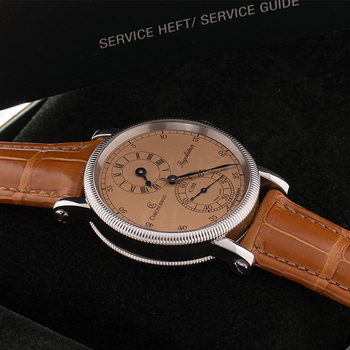 Copper-colored dial with printed minute track on the outer chapter ring and hour and seconds sub-dials at 3 and 6 o'clock positions respectively. Blued steel hands. Honey-colored semi-gloss alligator leather strap with a stainless steel tang buckle.