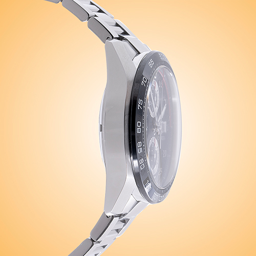 First, under the hood we find TAG Heuer’s self-winding automatic caliber 16, which delivers a 42-hour power reserve and gives you a small seconds at 9, a center red-tipped chronograph hand, and a 30-minute counter at 12 and a 12-hour counter at 6. In addition, there is a handy tachymetre scale upon the polished ceramic bezel.