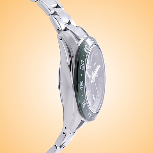The handsome green of the tough ceramic fixed bezel sports a 24-hour scale that can be used to read a GMT time zone in conjunction with the dashing yellow arm.