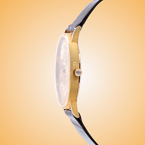 yellow gold coin-edged case is 35 mm in diameter, 6 mm in height, and