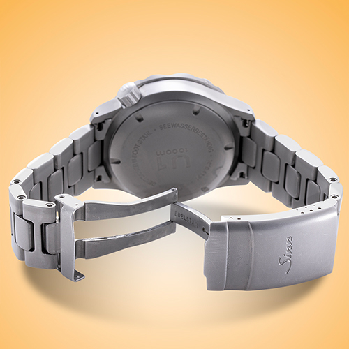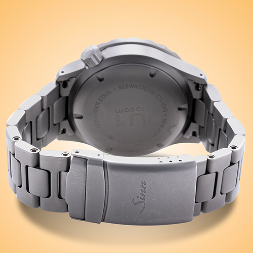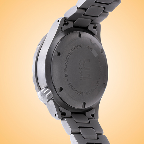 The rotating bezel with ratcheted minutes and dive scale is attached to the central section of the case as a “captive bezel” to ensure integrity at great depths. Speaking of great depths, the U1 is rated to a magnificent 1000 m / 100 atm water resistance.