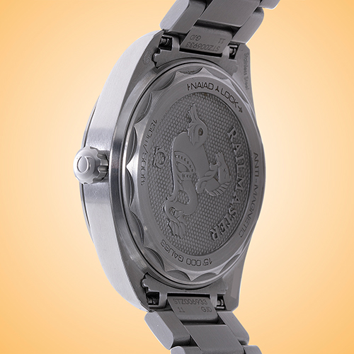 Its stainless steel case measures 40 mm in diameter and sports a screw-down winding crown, 150 m / 15 atm water resistance, and domed scratch-resistant sapphire crystal.