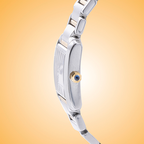 The boxy stainless steel case measures 25.35 x 20.3 mm, a slim 5.94 mm in height, and rests upon a stainless steel bracelet with 18K yellow gold links and a hidden folding clasp. The winding crown is also adorned with 18K yellow gold and set with a faceted crystal.