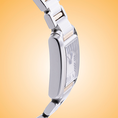 The stainless steel case measures 25.35 x 20.3 mm and rests upon a 18K yellow gold / stainless steel bracelet with a hidden butterfly folding buckle. Other features include a 20 m / 2 atm water resistance and a scratch-resistant sapphire crystal.