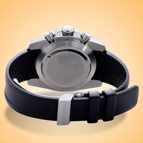 First, the cushion-shaped case is comfortable to wear and measures 41 mm in diameter, 14 mm in height, and rests upon a rubber strap with a folding clasp for added safety.