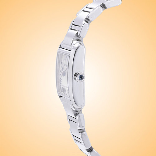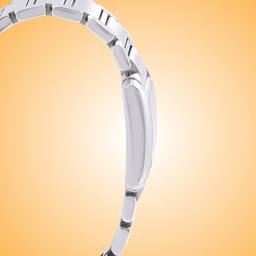 The stainless steel case measures 20 x 25 mm and rests upon a stainless steel bracelet with a hidden butterfly-style folding buckle. Other features include an ergonomic case design and a slightly domed scratch-resistant sapphire crystal.